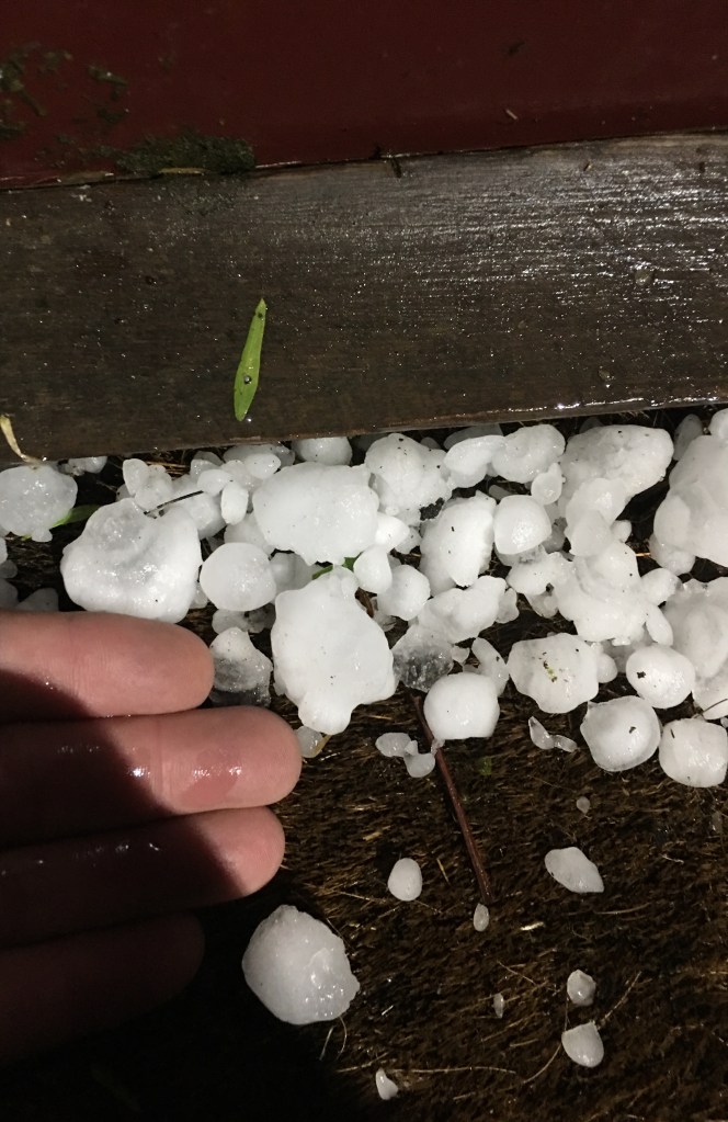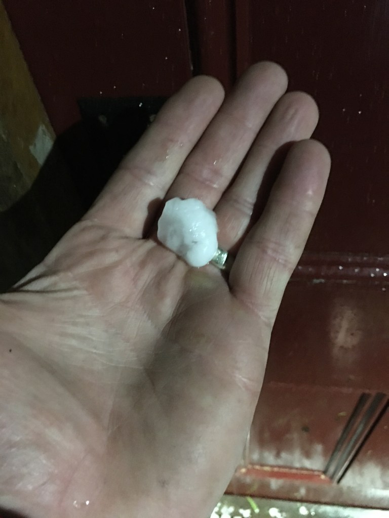 Last night a hail and thunder storm hit Putty at 7pm. It was not forecast. The northern end of Putty Valley had hail stones measuring 15mm and the rain gauge measured 19mm. However this would not have accounted for some hail which would have bounced out. Twelve hours later ice remained – see photo. Near the Putty Hall small hail with rain was reported. Today’s BOM forecast: ‘The chance of a thunderstorm on and east of the ranges in the afternoon and evening, possibly severe’.